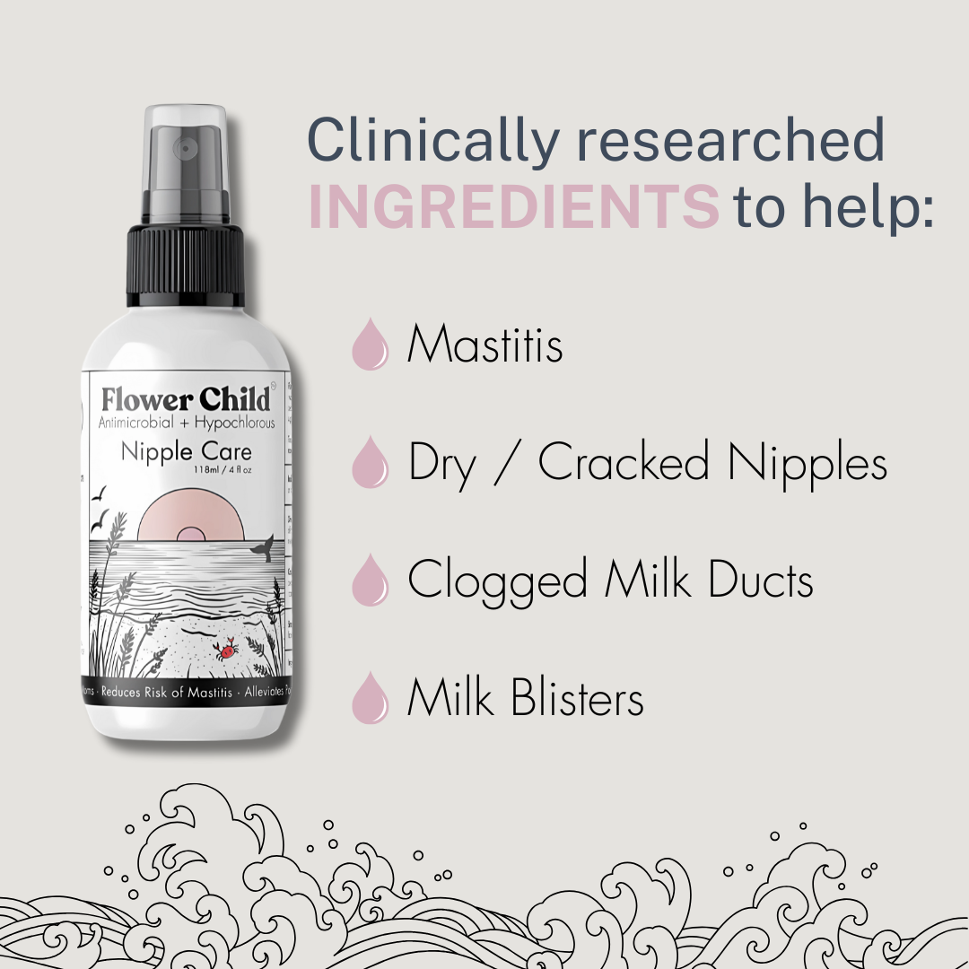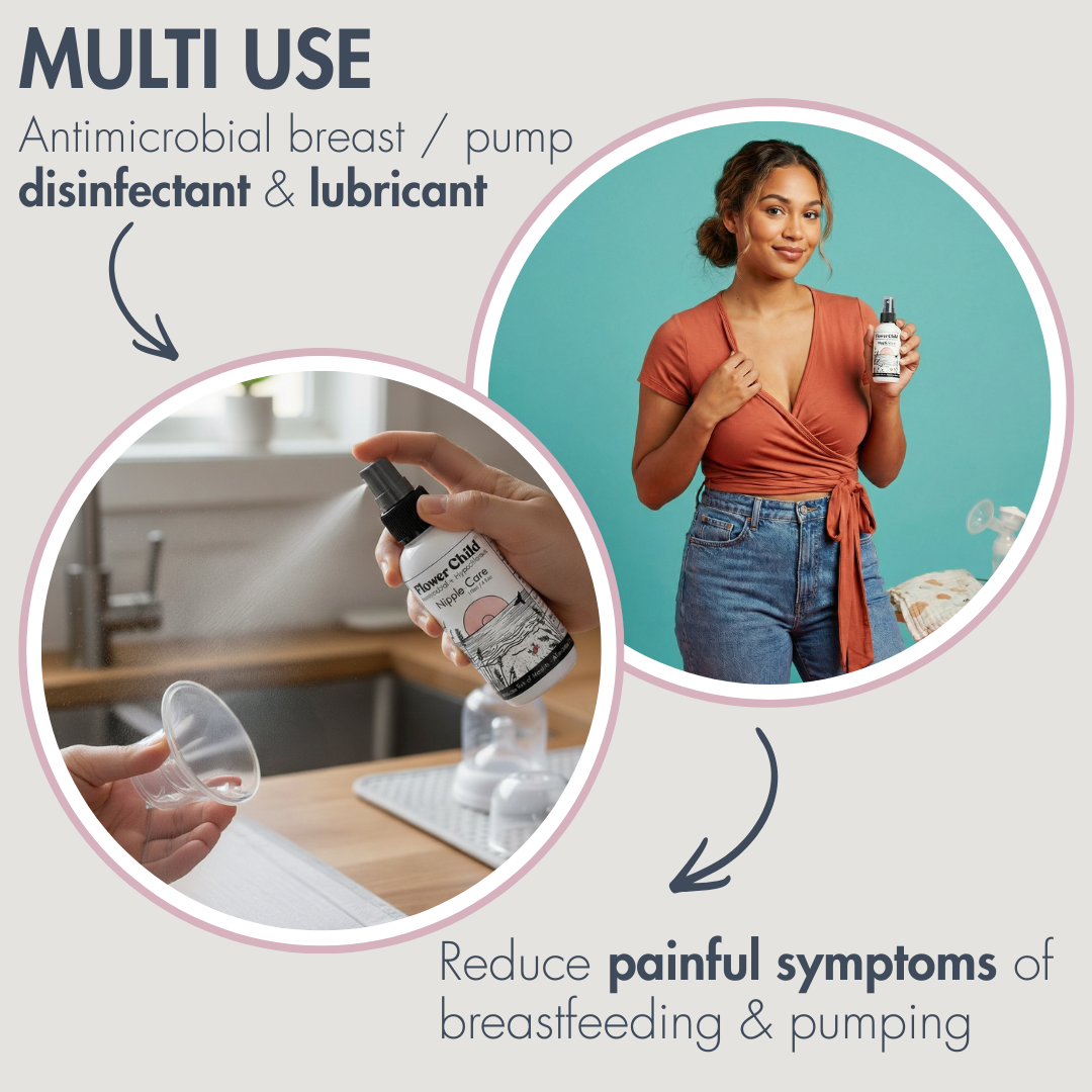 Flower Child’s Hypochlorous Nipple & Pumping Spray is a multi-purpose, ultra-gentle spray designed to support breastfeeding and pumping moms through every stage of their journey.
